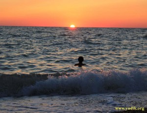 Главным преимуществом жилья была близость моря – не более 100 м от калитки. Т.е. мы с пляжа ходили домой попить чая. Море было тёплым, ласковым и чистым. Особенность Любимовки – почти постоянный ветер, который нагонял весёлые волны и улучшал восприятие крымской жары. А она в эти дни была рекордной. Из моря если и хотелось вылезать, то только в тень. В этом отношении мы проявили сообразительность и с раннего утра занимали своими карематами места под стенами пляжного тира, так что всегда могли спрятаться в тень, ещё и бесплатно. От нашего околотирного лежбища до кромки воды было метров 30.