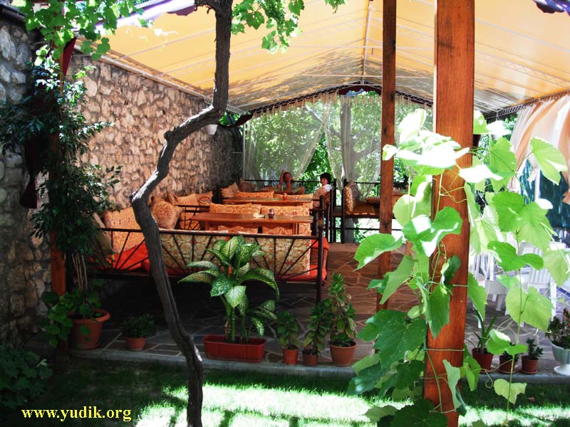 Солнце пекло нещадно, и правильным выбором было устроиться за дастарханом ресторана «Сейфи», расположен где-то в километре вверх от Ханского Дворца, в сторону Чуфут-кале. Не буду описывать всех кулинарных изысков, которые там удалось попробовать. Ограничу рекомендации двумя пунктами: Сефа – нежное шашлычное мясо, запечённое в виноградных листьях и Янтык – крымскотатарский чебурек, приготовляемый на сковороде без масла.